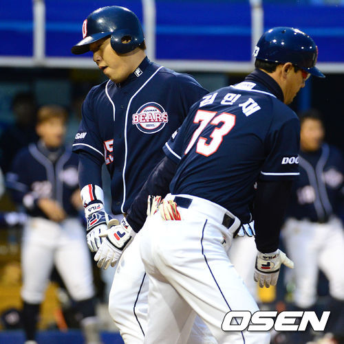 27일 오후 창원 마산야구장에서 열린 2013 한국야쿠르트 세븐프로야구 NC 다이노스와 두산 베어스의 경기, 6회초 무사 1루에서 두산 양의지가 좌월 투런 홈런을 치고 홈에서 김민재 코치와 하이파이브를 하고 있다.