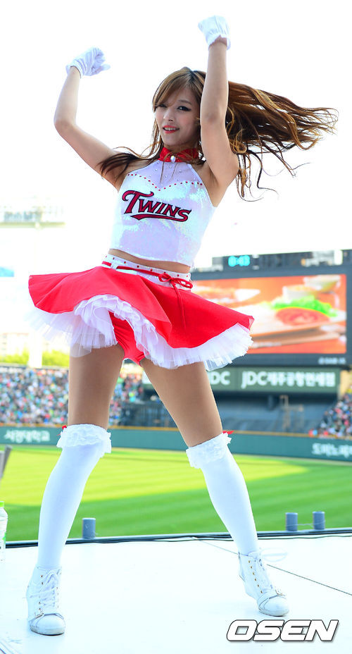 27일 오후 서울 잠실구장에서 열린 '2013 한국야쿠르트 세븐 프로야구' LG 트윈스와 롯데 자이언츠의 경기 LG 치어리더 강윤이가 화려한 무대를 선보이고 있다.