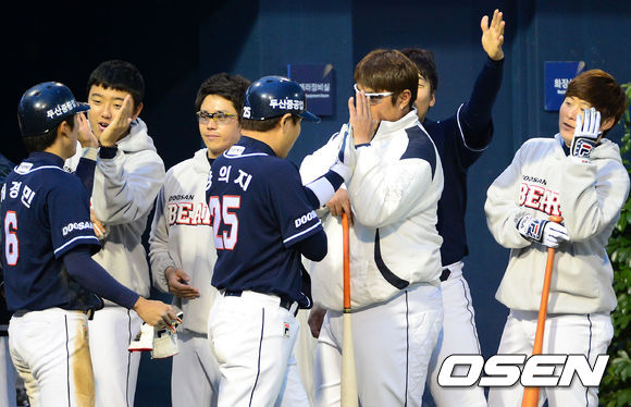 27일 오후 창원 마산야구장에서 열린 2013 한국야쿠르트 세븐프로야구 NC 다이노스와 두산 베어스의 경기, 6회초 무사 1루에서 두산 양의지가 좌월 투런 홈런을 치고 덕아웃에서 동료들의 축하를 받고 있다.