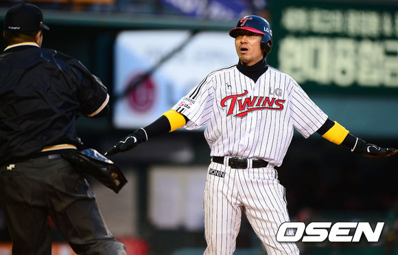 27일 오후 서울 잠실구장에서 열린 '2013 한국야쿠르트 세븐 프로야구' LG 트윈스와 롯데 자이언츠의 경기 7회말 1사 주자 2,3루 LG 정의윤의 3루수 앞 땅볼때 3루 주자 정성훈이 홈으로 쇄도했으나 롯데 강민호 포수에게 태그아웃을 당했다. 정성훈이 세이프가 아닌지 윤상원 구심에게 확인하고 있다.