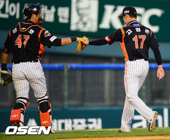 27일 오후 서울 잠실구장에서 열린 '2013 한국야쿠르트 세븐 프로야구' LG 트윈스와 롯데 자이언츠의 경기 7회말을 마친 롯데 고원준이 강민호와 하이파이브를 하고 있다.