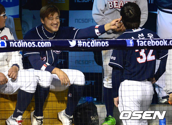 27일 오후 창원 마산야구장에서 열린 2013 한국야쿠르트 세븐프로야구 NC 다이노스와 두산 베어스의 경기, 6회초 두산 홍성흔이 덕아웃에서 김선우의 귀를 잡고 장난을 치고있다.