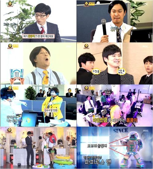 이날 ‘무한상사’의 직원으로 변한 멤버들은 정리해고의 대상이 되지 않기 위해 ‘무한상사’를 먹여 살릴 미래형 수트 제작 임무에 충실했다. 각자 제작한 기상천외한 수트를 입고 배구선수의 강 스파이크와 강풍, 폭우에 맞서는 등 해고당하지 않기 위해 아등바등하는 과정은 웃기기 그지 없었다.