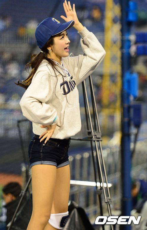 27일 오후 창원 마산야구장에서 열린 2013 한국야쿠르트 세븐프로야구 NC 다이노스와 두산 베어스의 경기, NC 치어리더 김연정이 화려한 공연을 펼치고 있다.