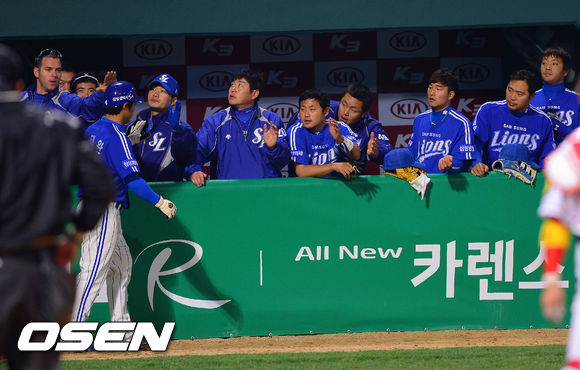 27일 오후 광주 무등구장에서 열린 '2013 한국야쿠르트 세븐 프로야구' KIA 타이거즈와 삼성 라이온즈의 경기, 8회초 1사 2루 삼성 배영섭의 1타점 적시타때 2루 주자 김태완이 홈을 밟은 후 동료들의 축하를 받고 있다