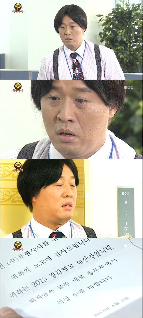 뒤늦게 알게 된 정과장은 “10년 동안 일했는데 이렇게 쫓겨난다”면서 울먹였다. 정준하의 눈물을 보는 다른 동료들은 할 말을 잃었다. 이날 ‘무한상사’는 뮤지컬 형태로 꾸려져 직장인의 애환을 담았다.