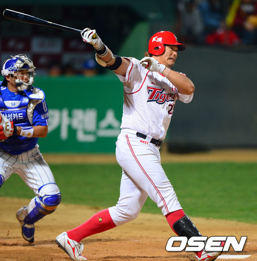27일 오후 광주 무등구장에서 열린 '2013 한국야쿠르트 세븐 프로야구' KIA 타이거즈와 삼성 라이온즈의 경기, 8회말 2사 1루 KIA 최희섭이 1타점 적시타를 날리고 있다