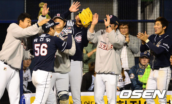 27일 오후 창원 마산야구장에서 열린 2013 한국야쿠르트 세븐프로야구 NC 다이노스와 두산 베어스의 경기, 8회초 1사에서 두산 박건우가 좌월 솔로 홈런을 치고 덕아웃에서 동료들의 축하를 받고 있다.