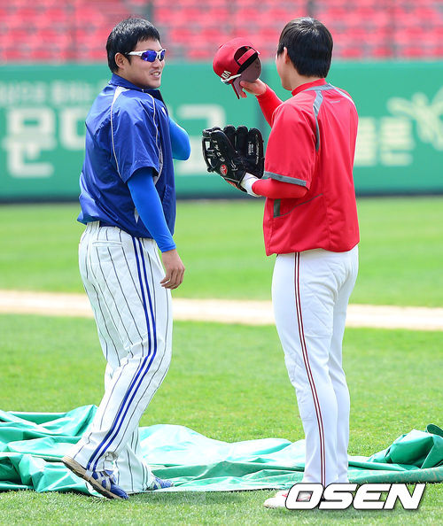 28일 오후 광주 무등야구장에서 열린 2013 한국야쿠르트 세븐프로야구 KIA 타이거즈와 삼성 라이온즈의 경기, 경기에 앞서 삼성 이지영과 KIA 안치홍이 이야기를 나누고 있다.