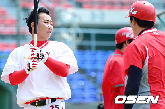 28일 오후 광주 무등야구장에서 열린 2013 한국야쿠르트 세븐프로야구 KIA 타이거즈와 삼성 라이온즈의 경기, 경기에 앞서 KIA 이범호가 타격 훈련 중 동료들을 바라보고 있다.