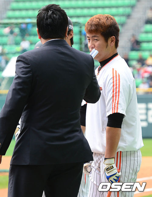 28일 오후 서울 잠실구장에서 열리는 '2013 한국야쿠르트 세븐 프로야구' LG 트윈스와 롯데 자이언츠의 경기 시작 전 강민호와 양준혁 해설위원이 이야기를 나누고 있다.