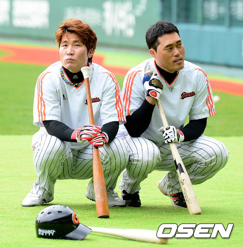 28일 오후 서울 잠실구장에서 열리는 '2013 한국야쿠르트 세븐 프로야구' LG 트윈스와 롯데 자이언츠의 경기 시작 전 훈련에서 용덕한과 조성환이 나란히 앉아 있다.