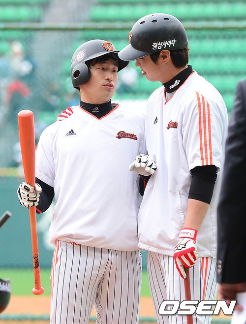 28일 오후 서울 잠실구장에서 열리는 '2013 한국야쿠르트 세븐 프로야구' LG 트윈스와 롯데 자이언츠의 경기 시작 전 손아섭과 김대우가 이야기를 나누고 있다.