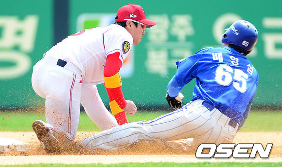 28일 오후 광주 무등야구장에서 열린 2013 한국야쿠르트 세븐프로야구 KIA 타이거즈와 삼성 라이온즈의 경기, 1회초 무사 1루에서 삼성 조동찬 타석 때 1루주자 배영섭이 도루를 시도했으나 KIA 안치홍에게 태그아웃 되고 있다.