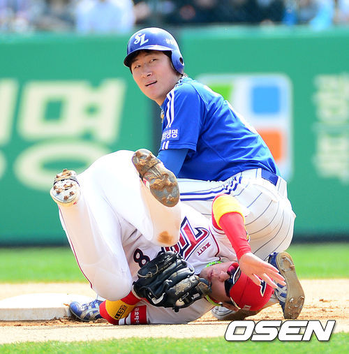 28일 오후 광주 무등야구장에서 열린 2013 한국야쿠르트 세븐프로야구 KIA 타이거즈와 삼성 라이온즈의 경기, 1회초 무사 1루에서 KIA 안치홍이 삼성 1루주자 배영섭의 도루를 저지하는 과정에서 충돌하며 넘어지고 있다.