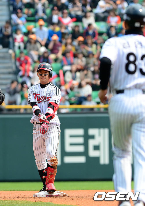 28일 오후 서울 잠실구장에서 열린 '2013 한국야쿠르트 세븐 프로야구' LG 트윈스와 롯데 자이언츠의 경기 2회말 1사 2루 정주현이 1타점 적시타를 치고 2루 베이스에 서 있다. 정주현은 우익수 실책으로 2루까지 진루.