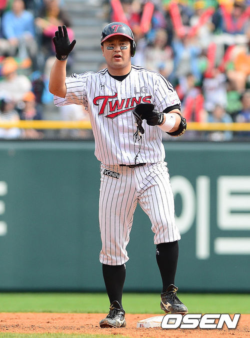 28일 오후 서울 잠실구장에서 열린 '2013 한국야쿠르트 세븐 프로야구' LG 트윈스와 롯데 자이언츠의 경기 4회말 2사 1루 최경철이 1타점 2루타를 치고 2루 베이스에 서 있다.