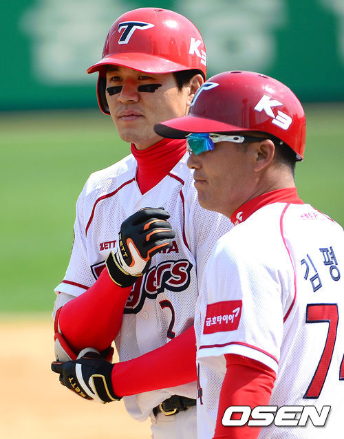 28일 오후 광주 무등야구장에서 열린 2013 한국야쿠르트 세븐프로야구 KIA 타이거즈와 삼성 라이온즈의 경기, 3회말 2사 2루에서 KIA 신종길이 좌전 적시타를 치고 김평호 코치와 하이파이브를 하고 있다.
