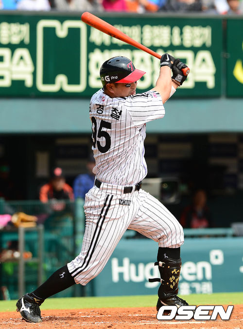 28일 오후 서울 잠실구장에서 열린 '2013 한국야쿠르트 세븐 프로야구' LG 트윈스와 롯데 자이언츠의 경기 4회말 2사 1루 최경철이 1타점 2루타를 치고 있다.