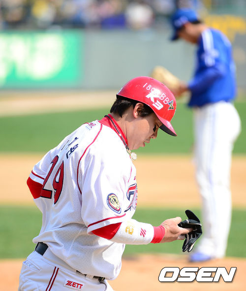 28일 오후 광주 무등야구장에서 열린 2013 한국야쿠르트 세븐프로야구 KIA 타이거즈와 삼성 라이온즈의 경기, 4회말 무사에서 KIA 나지완이 몸에 맞는 볼로 출루하고 있다.