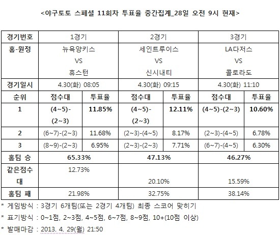 한편 이번 야구토토 스페셜 11회차 게임은 한국시간으로 30일 아침에 경기가 열리기 때문에 29일 밤 9시 50분에 발매가 마감된다.