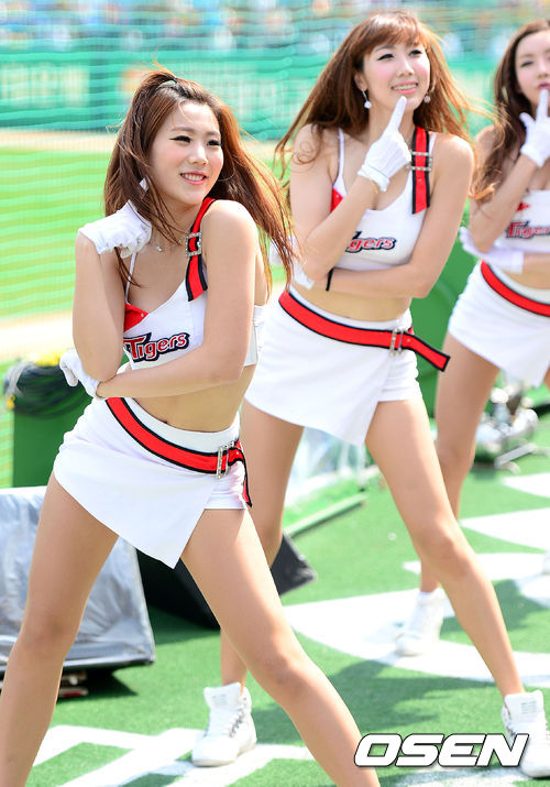 28일 오후 광주 무등야구장에서 열린 2013 한국야쿠르트 세븐프로야구 KIA 타이거즈와 삼성 라이온즈의 경기, KIA 치어리더가 화려한 공연을 펼치고 있다.