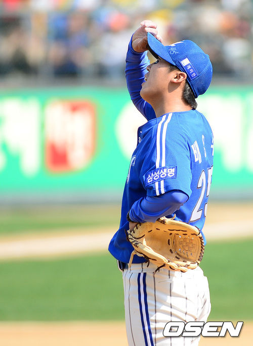 28일 오후 광주 무등야구장에서 열린 2013 한국야쿠르트 세븐프로야구 KIA 타이거즈와 삼성 라이온즈의 경기, 5회말 1사에서 삼성 배영수가 KIA 홍재호에게 좌전 안타를 허용하고 아쉬워하고 있다.