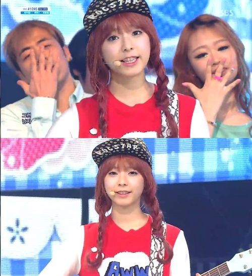 이날 주니엘은 귀여운 빨간 티셔츠에 파란 스커트, 발랄해보이는 모자를 쓴 채 무대에 올랐다. 그간 성숙해보였던 모습과는 180도 다른 모습이었다.