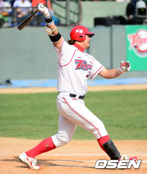 28일 오후 광주 무등야구장에서 열린 2013 한국야쿠르트 세븐프로야구 KIA 타이거즈와 삼성 라이온즈의 경기, 6회말 1사 1루에서 KIA 최희섭이 우전 안타를 치고 있다.