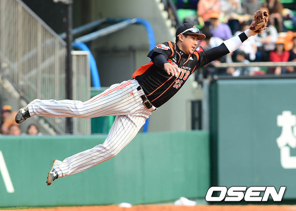 28일 오후 서울 잠실구장에서 열린 '2013 한국야쿠르트 세븐 프로야구' LG 트윈스와 롯데 자이언츠의 경기 7회말 2사 박용택의 타구를 황재균이 다이빙캐치를 시도하였으나 안타를 허용하고 있다.