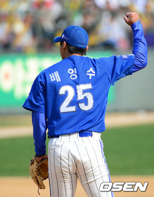 28일 오후 광주 무등야구장에서 열린 2013 한국야쿠르트 세븐프로야구 KIA 타이거즈와 삼성 라이온즈의 경기, 6회말 2사 1,3루에서 삼성 배영수가 KIA 안치홍을 내야 땅볼로 처리하고 환호하고 있다.