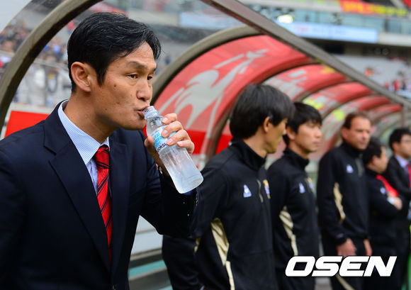 28일 오후 서울 상암동 서울월드컵경기장에서 열린 '현대오일뱅크 K리그 클래식 2013 9라운드' FC 서울과 강원 FC의 경기, 경기에 앞서 FC서울 최용수 감독이 물을 마시고 있다