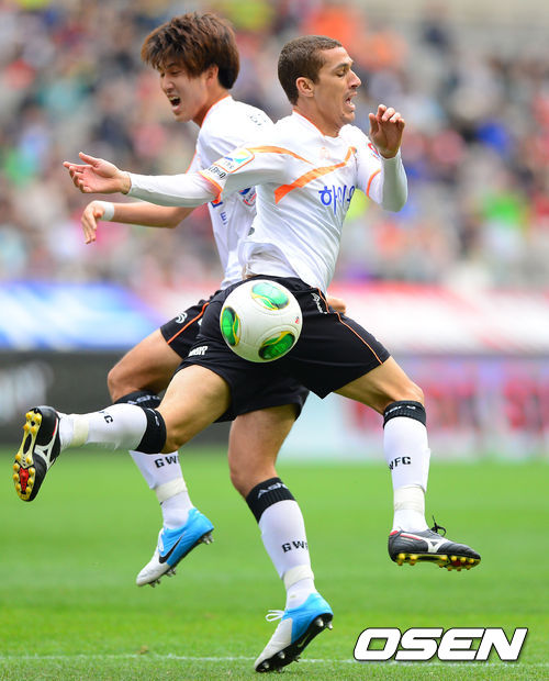 28일 오후 서울 상암동 서울월드컵경기장에서 열린 '현대오일뱅크 K리그 클래식 2013 9라운드' FC 서울과 강원 FC의 경기, 전반 강원FC 박민과 웨슬리가 충돌하고 있다