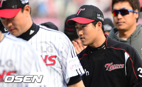 28일 오후 서울 잠실구장에서 열린 '2013 한국야쿠르트 세븐 프로야구' LG 트윈스와 롯데 자이언츠의 경기 종료 후 신정락이 동료들과 하이파이브를 하고 있다.