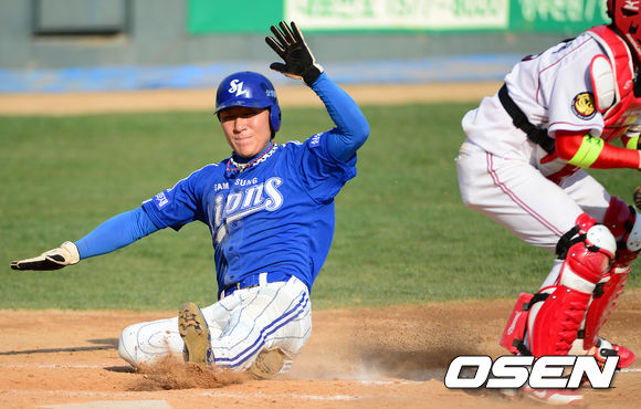 28일 오후 광주 무등야구장에서 열린 2013 한국야쿠르트 세븐프로야구 KIA 타이거즈와 삼성 라이온즈의 경기, 8회초 1사 2루에서 삼성 이승엽의 동점 적시타 때 2루주자 배영섭이 홈을 밟고 있다.