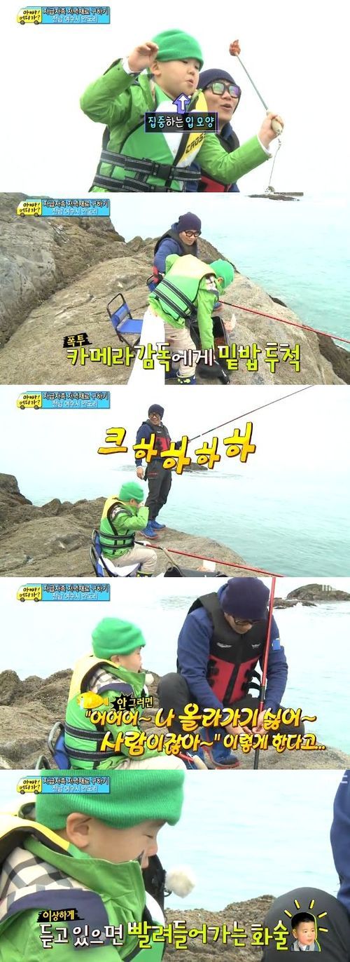 아들 후도 마찬가지였다. 그는 밑밥을 바다로 던지라는 아빠의 말에 자기 키보다 큰 작대기로 밑밥을 퍼 바다로 던졌다. 그러나 밑밥이 향한 곳은 바다가 아닌 카메라감독. 후는 진지한 표정으로 어설픈 낚시 실력을 선보여 아빠 윤민수에게 웃음을 선사했다.