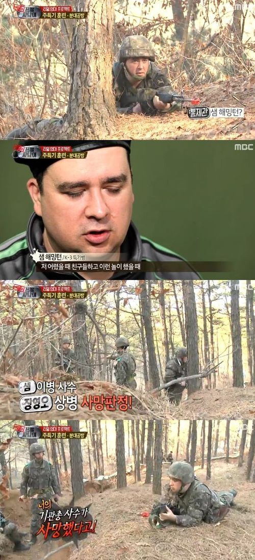 샘 해밍턴은 28일 오후 방송된 MBC 예능프로그램 ‘일밤-진짜 사나이’에서 주특기로 정해진 분대공방 훈련에 돌입했다.