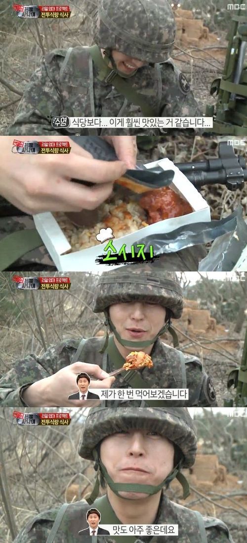전투식량이란 전장이나 야외 훈련 시 먹는 것으로, 이날 류수영이 먹은 군대식량은 꿇인 물을 이용한 구형이 아닌 발열팩으로 만들어 먹는 2013년 신형이었다.