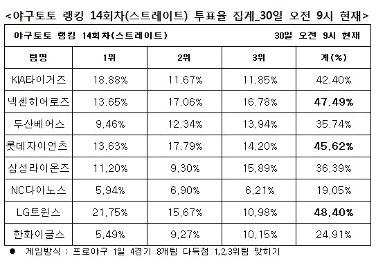 국민체육진흥공단(www.kspo.or.kr)이 발행하는 체육진흥투표권 수탁사업자인 스포츠토토 공식발매사이트인 베트맨(www.betman.co.kr)은 내달 1일에 개최되는 두산-KIA, 한화-롯데, 삼성-넥센, NC-LG 등 4경기 8개팀을 대상으로 한 야구토토 랭킹 14회차 스트레이트 게임 중간집계결과 LG(48.40%), 넥센(47.49%), 롯데(45.62%)를 차례로 다득점 상위 3개팀으로 꼽았다고 밝혔다. 반면 한화(24.91%), NC(19.05%)는 가장 적은 득점을 기록할 것으로 예상했다.