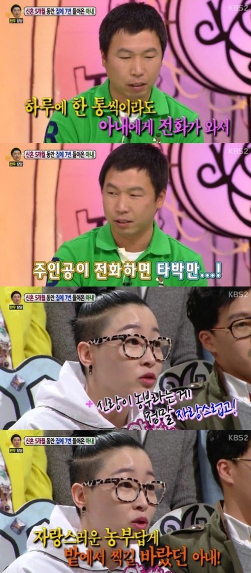 한편 ‘농부의 아내’ 편 고민자의 사연에 따르면 아내는 논에서 웨딩촬영을 고집한 것은 기본이고 신혼 5개월 동안 집에 단 7번 밖에 들어오지 않아 모두를 놀라게 했다. 자유분방한 성격의 아내를 둔 남편은 “결혼하고 한 번도 합방을 안 했다. 일주일에 두세 번이라도 집에 들어와 줬으면 좋겠다”는 바람을 전해 새로운 1승을 차지했다.