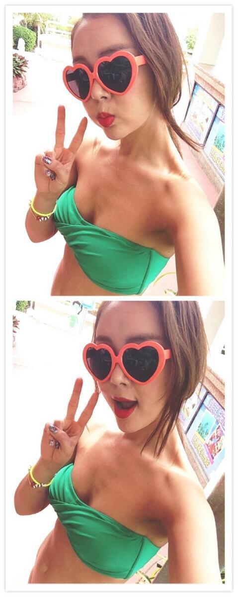 사진 속 백보람은 초록색의 비키니를 입은 채 독특한 모양의 선글라스를 착용하고 있다. 뛰어난 몸매와 귀여운 표정이 뜨거운 계절에 어울리는 상큼한 매력을 드러내는 모습이다.