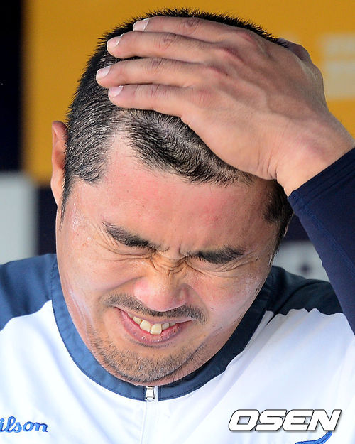 30일 오후 창원 마산구장에서 열리는 '2013 한국야쿠르트 세븐 프로야구' NC 다이노스와 LG 트윈스의 경기에 앞서 삭발을 한 NC 이호준이 더그아웃에서 땀을 닦고 있다.