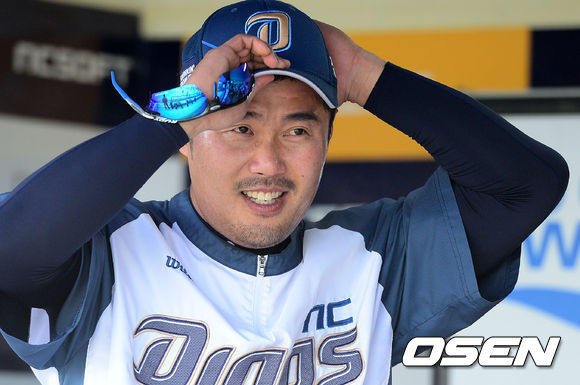 30일 오후 창원 마산구장에서 열리는 '2013 한국야쿠르트 세븐 프로야구' NC 다이노스와 LG 트윈스의 경기에 앞서 삭발을 한 NC 이호준이 더그아웃에서 땀을 닦고 있다. 이호준은 이날 1500번째 출장을 앞두고 있다.