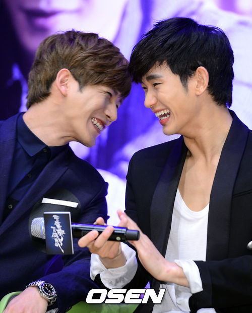 30일 오후 서울 건국대학교 새천년관에서 진행된 '은밀하게 위대하게(장철수 감독) 출정식'에서 박기웅과 김수현이 미소짓고 있다.
