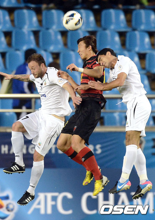 30일 오후 포항 스틸야드에서 열린 2013 아시아축구연맹(AFC) 챔피언스리그 G조 6차전 포항 스틸러스와 분요드코르의 경기, 전반 포항 고무열이 분요드코르 수비수들과 공중볼 경합을 벌이고 있다.