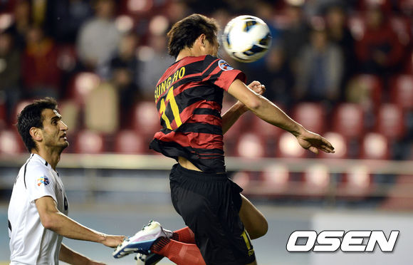 30일 오후 포항 스틸야드에서 열린 2013 아시아축구연맹(AFC) 챔피언스리그 G조 6차전 포항 스틸러스와 분요드코르의 경기, 전반 포항 박성호가 헤딩슛을 시도하고 있다.