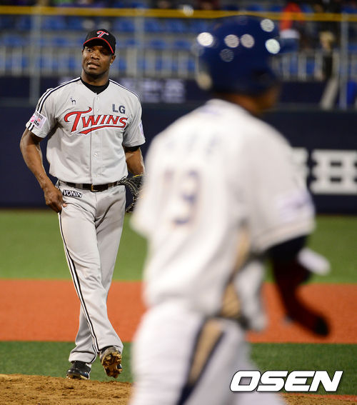30일 오후 창원 마산구장에서 열린 '2013 한국야쿠르트 세븐 프로야구' NC 다이노스와 LG 트윈스의 경기, 4회말 2사에서 LG 리즈가 NC 박정준에 볼넷을 허용하며 첫 출루를 허용하고 있다.