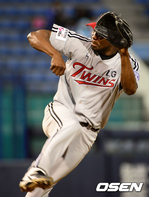30일 오후 창원 마산구장에서 열린 '2013 한국야쿠르트 세븐 프로야구' NC 다이노스와 LG 트윈스의 경기, 4회말 2사에서 LG 리즈가 힘차게 볼을 뿌리고 있다.