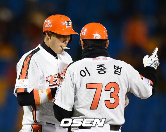 30일 오후 대전구장에서 열린 '2013 한국야쿠르트 세븐 프로야구' 한화 이글스와 롯데 자이언츠경기, 4회말 1사 2루 정범모 1타점 적시타를 날리고 2루까지 진루 마우스피스를 벗으며 이종범 코치의 이야기를 듣고 있다.