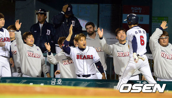30일 오후 서울 잠실구장에서 열린 '2013 한국야쿠르트 세븐 프로야구' 두산 베어스와 KIA 타이거즈의 경기 4회말 무사 1루 양의지의 1타점 2루타에 홈을 밟은 허경민이 덕아웃에서 동료들과 하이파이브를 하고 있다.